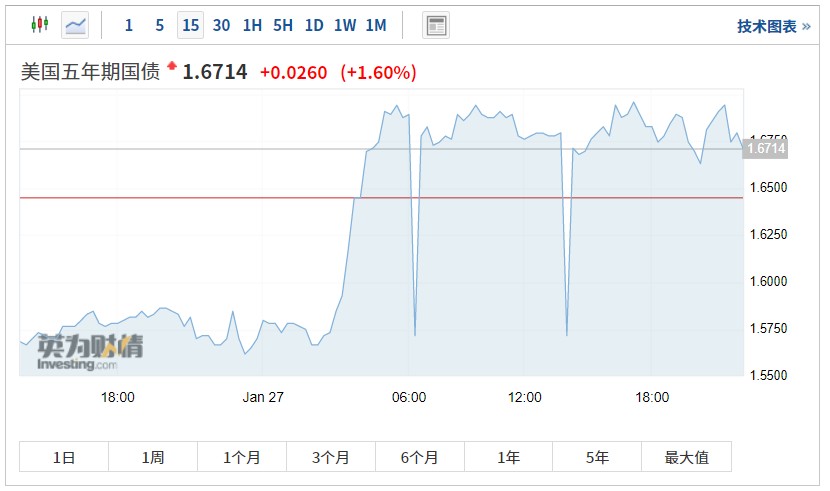 鮑威爾鷹派言論發表后,市場交易員正加大對美聯儲加息的押注,貨幣市場目前預計美聯儲今年將加息5次,投資者也在猜測是否會在3月加息50個基點。 受此影響,截至發稿,美國5年期國債收益率漲1.6%,報1.671。 美元指數漲0.7%,報97.97。