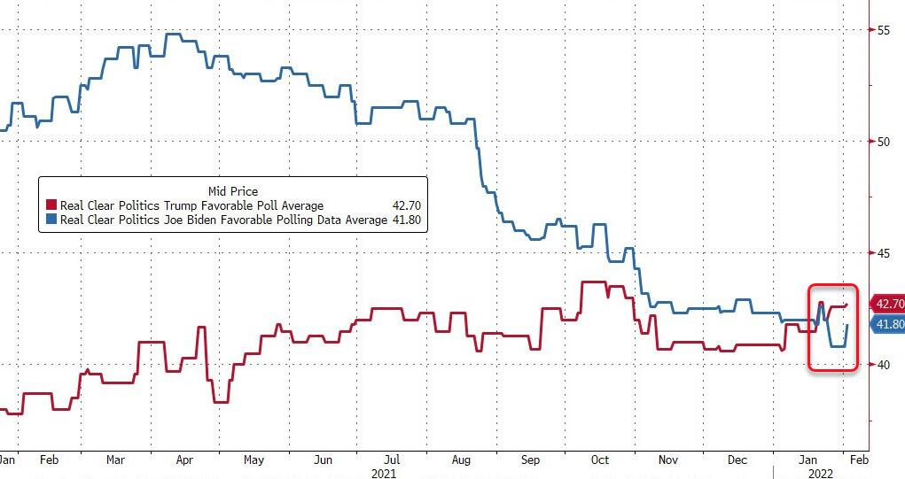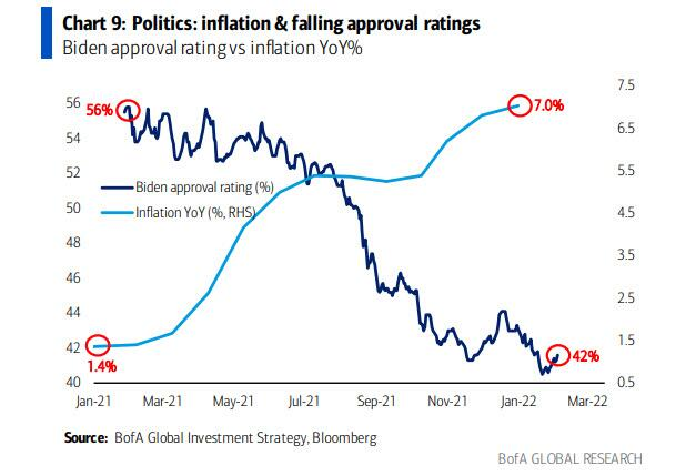 更糟糕的是,美國銀行(48.281.85, 3.98%, )的研究顯示,拜登的支援率和通脹水準正在出現一種背離的趨勢:隨著通脹率從去年1月的1.4%飆升至今年1月的7%,拜登的支援率正從56%回落至42%。