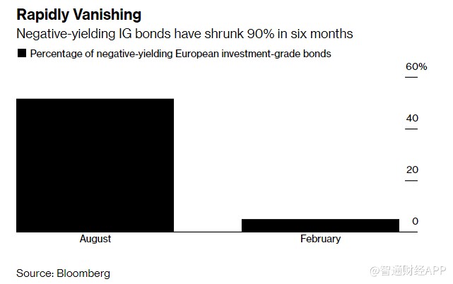 公司債券收益率甚至更快轉為正值。 Bloomberg 追蹤歐元投資級債券的指數顯示,目前只有約5%的債券收益率低於零,而六個月前的比例還超過50%。