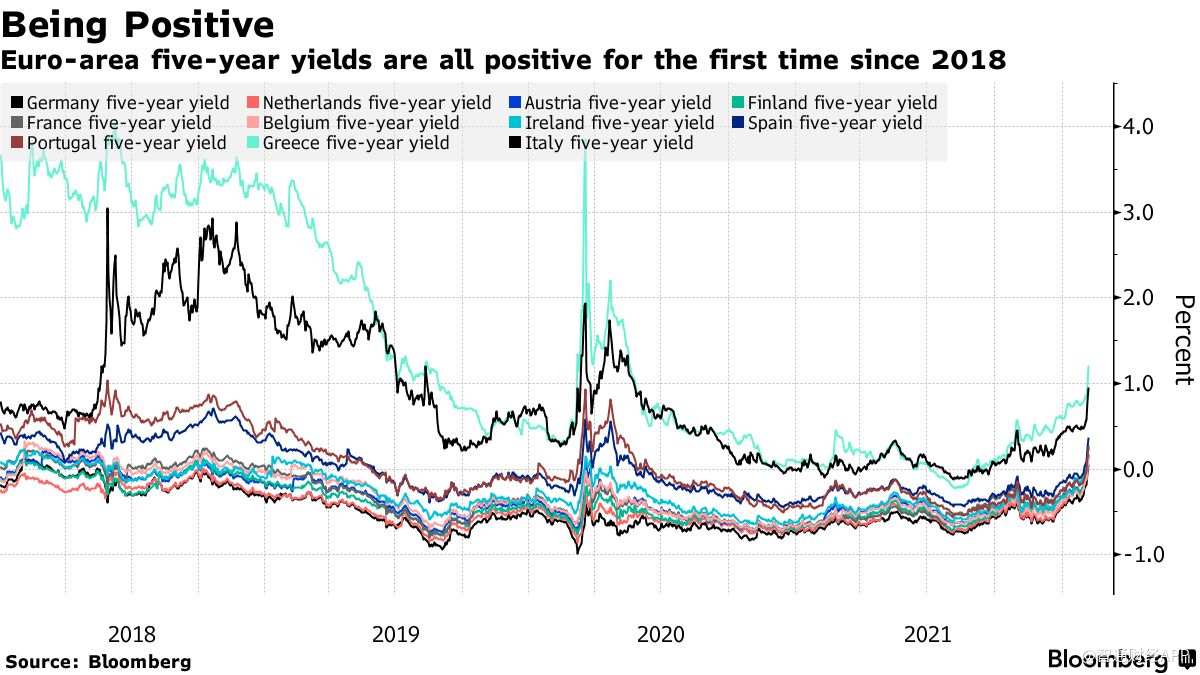 過去一周,由於交易員押注歐洲央行將收緊政策以對抗創紀錄的通脹,歐洲地區的一系列國債收益率轉向正值。 市場目前預計,歐洲央行將在2022年將存款利率上調50個基點,使其近8年來首次升至0%。