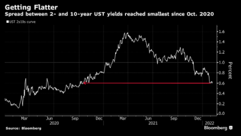 1月份時,2年期和10年期美國國債收益率之差曾縮小至2020年10月以來的最窄水準。 雖然其中一些走勢,特別是短期國債收益率上升,可歸因於即將到來的利率變化,但收益率趨平曲線可能是一個警告,即美國經濟增長不會像許多人預期的那樣強勁。
