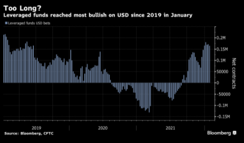 CFTC數據顯示,雖然美元的投機性頭寸仍接近2019年以來最看漲的水準,但槓桿基金已經開始減少一些押注。