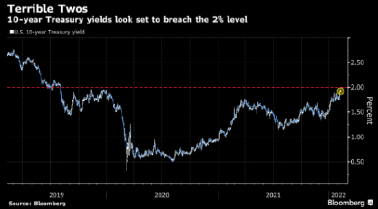 美國10年期國債收益率自8月份以來已飆升約80個基點。 交易員提高了對美聯儲今年加息的預期,併為3月可能出現的大幅加息做好了準備。 10年期美債收益率週二在亞洲交易時段報1.93%,略低於大流行前水準,如果突破2%,將是2019年8月以來首次。
