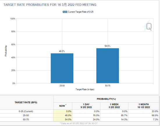 持續爆表的通脹也令市場將目光對準了美聯儲。 根據CME「美聯儲觀察工具」,在CPI數據公佈后,3月中旬美聯儲FOMC加息50個基點的預期概率已經從昨天的24%飆升至54%。