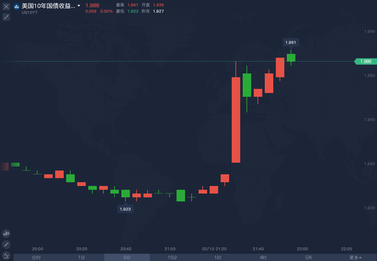 美國10年期國債收益率在數據公佈后短線走高,一度漲至1.986%,為2019年8月以來的最高水準,逼近2%關口。