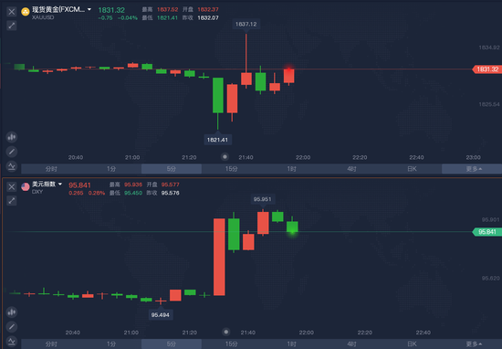 數據公佈后,現貨黃金再現過山車行情,先短線下挫后強力反彈,之後再下挫,波幅逾16美元,最低至1821.6美元/盎司,最高報1837.14美元/盎司。 COMEX最活躍黃金期貨合約日期:2月10日21:30一分鐘內買賣盤面瞬間成交5006手,交易合約總價值9.13億美元。