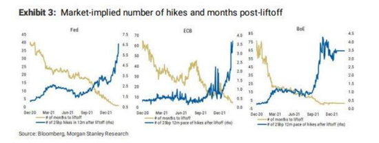 在過去的半年裡,許多機構連續上調了通脹預期。 隨著通脹繼續意外上行,市場已經消化了主要發達國家央行更頻繁和更迅速的加息預期。 那麼多大的加息幅度才算過多? 這成為市場和各經濟體都需要考慮的問題。 以下為大摩對主要發達央行貨幣政策收緊路徑的預期。