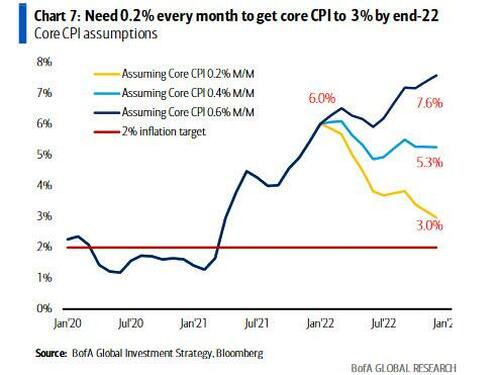 根据Hartnett的测算,1月CPI为7.5%,核心CPI为6.0%(40年来最高),如果核心CPI月继续以环比0.6%的速度激增,年终通胀将达到7-8%,若以0.4%的速度增加,年终通胀率将达到5-6%,另外,若以0.2%的速度增加,到今年年底核心CPI将达到3%。
