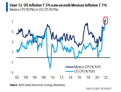 美國7.5%的通貨膨脹率甚至超過了墨西哥7.1%的通貨膨脹率。 鑒於美聯儲政策利率為0%,而墨西哥央行政策利率為5.5%,這種情況並不常見。