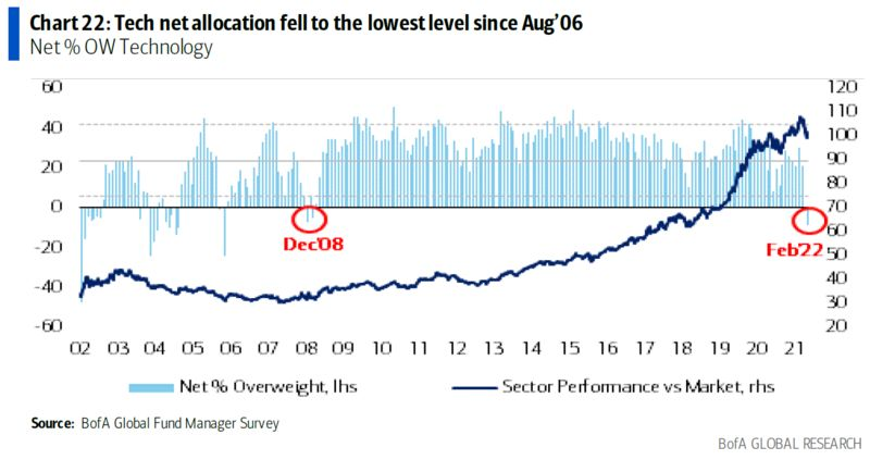 財聯社(上海,編輯 牛占林)訊,據美國銀行(47.790.37, 0.78%, )最新的調查顯示,在市場準備迎接美聯儲大幅收緊貨幣政策之際,基金經理們近16年來從未像現在這樣看跌科技股。