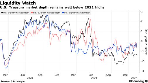 智通財經觀察到,上周有關美聯儲今年將加息多少和多快的爭議引發收益率劇烈波動,美國國債市場的流動性再次受到侵蝕。