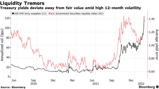 衡量收益率與公允價值模型之間偏差的彭博美國政府證券流動性指數正在逼近去年11月初創下的高點。 當時,對美聯儲加息的預期於10月份開始升溫,導致短期美國國債收益率出現歷史性的大幅日波動。
