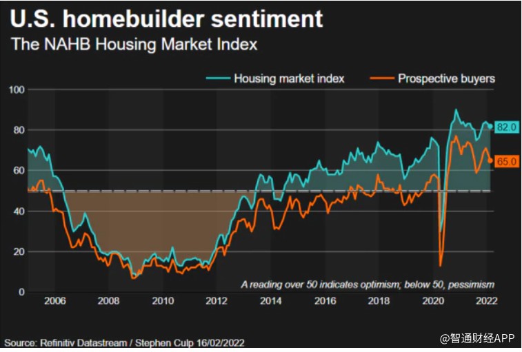 根據美國NAHB房價指數,建築商對新建獨立屋市場的信心在2月份下降了1點,達到82點,這已經是連續第二個月出現信心下滑。 任何高於50的數據都被認為是積極的。 相比之下,該指數在2021年2月為84。