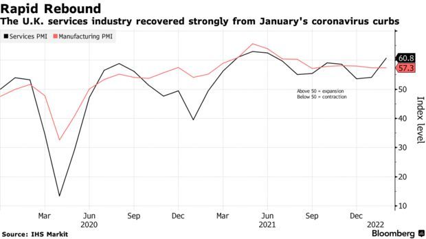 在1月份受Omicron疫情打擊后,隨著防疫限制措施解除,英國服務業在2月份的反彈速度快於預期,這將給英國央行帶來進一步加息的壓力。