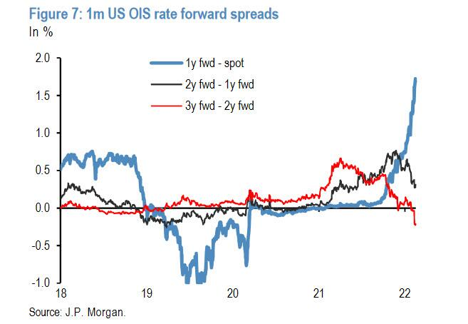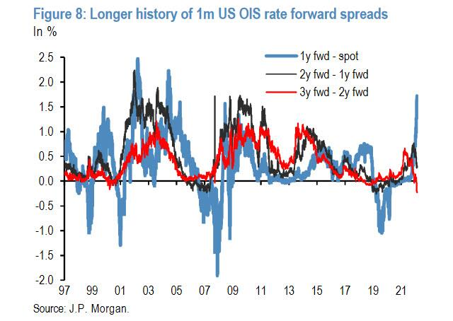 在最近的研報里,摩根大通的分析師 Nick Panigirtzoglou 注意到了一個極為罕見的「危機信號」:「遠期OIS曲線已開始顯示反轉跡象。 ”