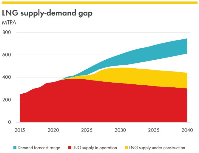 殼牌對液化天然氣看法的核心是,該公司預計到2040年,天然氣需求將增長近一倍。 按照2021年約3.8億噸/年的數據來看,市場預計在未來二十年天然氣需求將增長至7億噸/年。 與此同時,殼牌表示在未來二十年內,該公司天然氣供應量約為500噸/年,市場將在本世紀中期出現歷史性的供應不足。